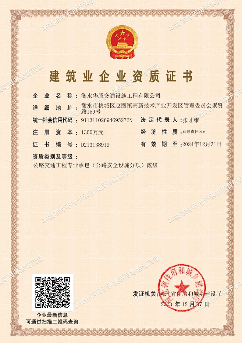 衡水華騰交通設(shè)施工程有限公司是一家公路工程綜合性企業(yè),具備河北省住房和城鄉(xiāng)建設(shè)廳核發(fā)的建筑業(yè)企業(yè)資質(zhì)證書(shū)(公路交通工程承包貳級(jí)),本公司承擔(dān)公路標(biāo)線(xiàn)、標(biāo)志、護(hù)欄、隔離柵、防眩板工程施工及按裝,并生產(chǎn)常溫型丙烯酸公路涂料、熱熔公路涂料、突起震動(dòng)涂料,以上產(chǎn)品完全由我公司生產(chǎn)合成完成,達(dá)到交通部JT/T280-2......